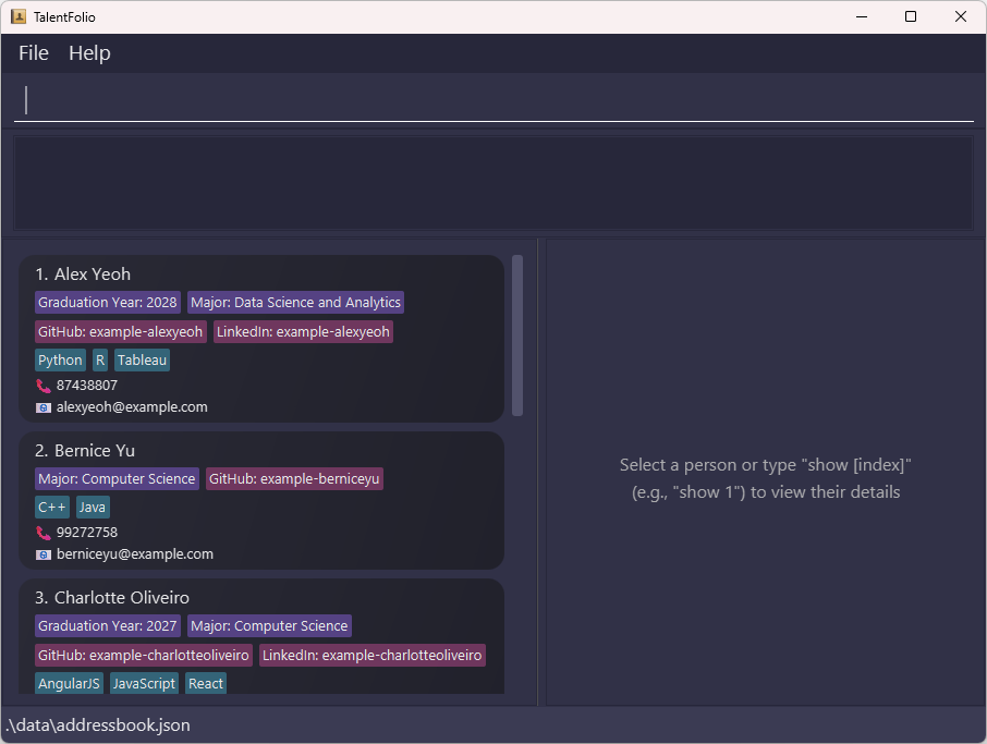 TalentFolio is an application for hiring managers to manage information on job candidates. It is optimized for users who prefer a Command Line Interface (CLI) while still having the benefits of a Graphical User Interface (GUI). If you can type fast, TalentFolio lets you handle your recruitment tasks more efficiently compared to traditional GUI applications!