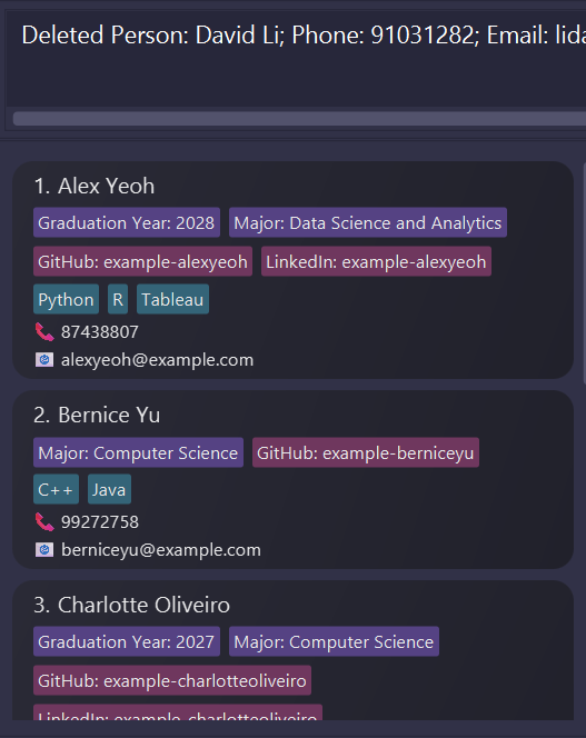 Results after typing find alex daviddeleteDeletes the specified person.