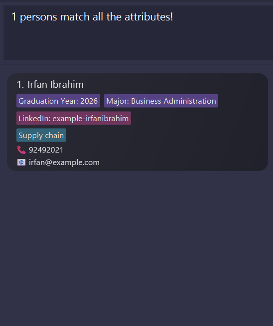 | Add | add n/NAME p/PHONE_NUMBER e/EMAIL [t/TAG]… [a/ATTRIBUTE_NAME=ATTRIBUTE_VALUE]… Example: add n/James Ho p/22224444 e/jamesho@example.com t/C++ t/Java a/Major=Data Science and Analytics |