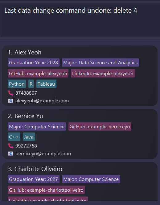For instance, suppose a user intended to type delete 5 but accidentally types and executes delete 4. They can just type undo to restore the deleted entry.